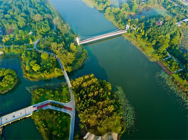 蓝图背面,离不开“两山”理念在宿迁大地上的生根发芽。2025年是“绿水青山便是金山银山”理念(以下简称“两山”理念)提出20周年,二十年岁月流通,现在散步宿迁,骆马湖畔、洪泽湖湿地,数万亩围网饲养设备悄然离场,碧水重现,水草丰茂的湿地ECO逐渐复苏,化身珍稀鸟类留恋的休息天堂;三台山国家森林公园通过大规模水系构建与植被康复,从一片“荒山秃岭”蝶变为闻名生态休闲景区;宿城区耿车镇以生态修正和公共空间管理,完结从“废物镇”到“生态镇”的富丽回身;泗阳县龙窝潭生态安全缓冲区作为“黄河故道生态富民廊道”项目的重要组成部分,通过对原有水沟河道施行科学改造和景象进步,现在完结岸清水绿,栈桥畔繁花似锦,引得游人纷繁停步……一场绿色嬗变正在宿迁大地演出。
